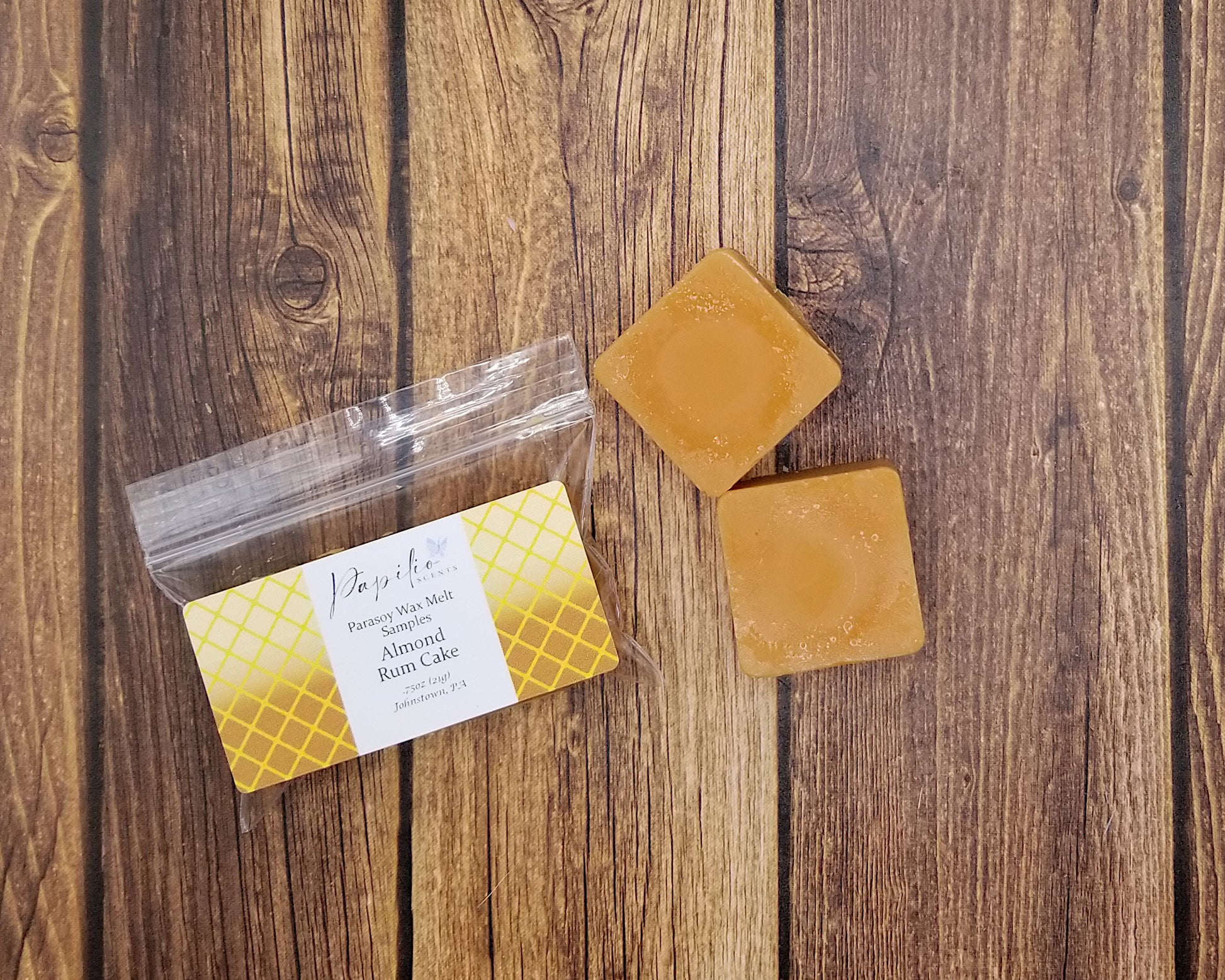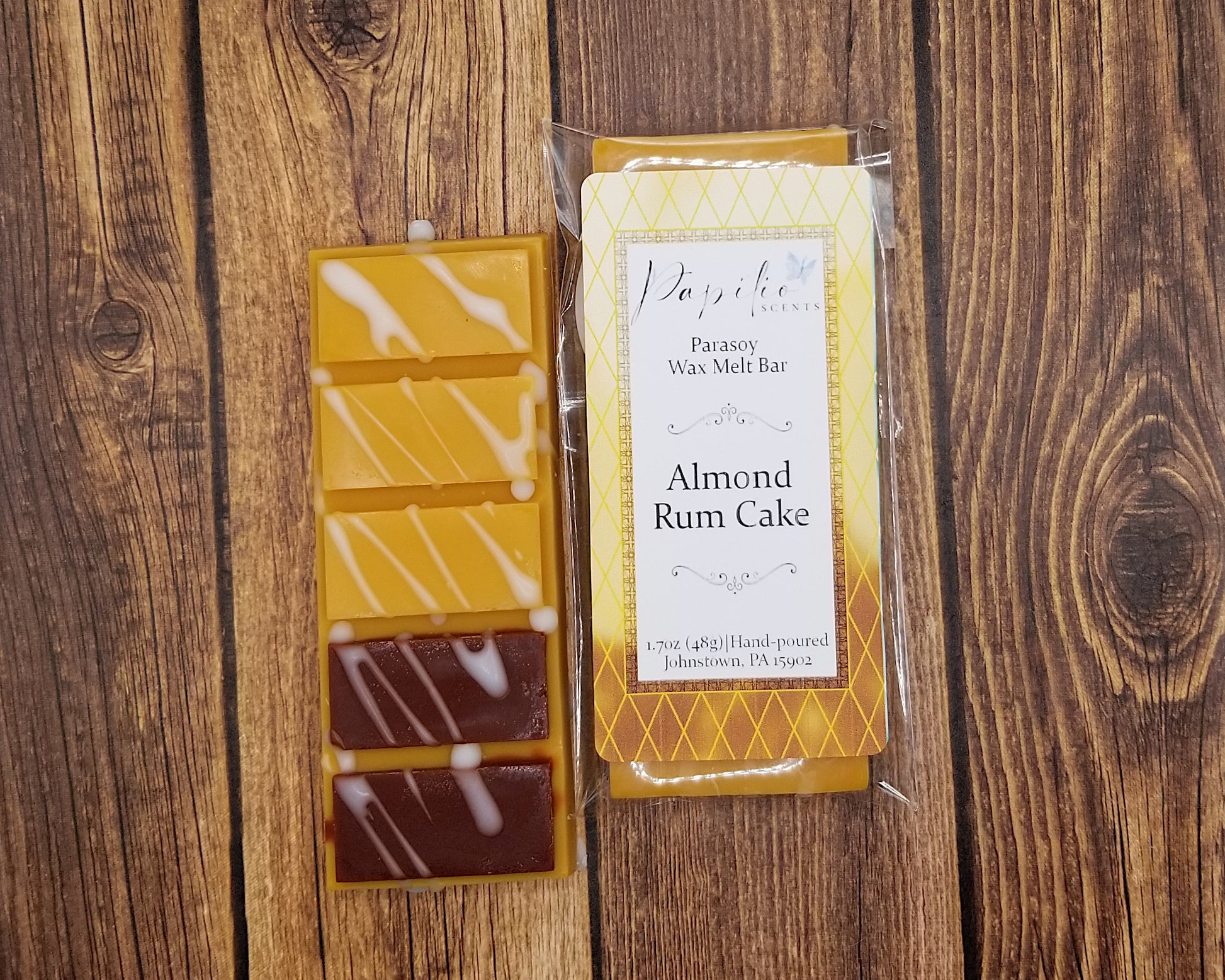 These wax melts are made with a mix of paraffin and soy (parasoy) wax to help give it a longer melt time while keeping the scent on the stronger side. Due to the handmade nature of these wax melts, there will be slight differences between melts such as glitter placement, drizzle location, and color.