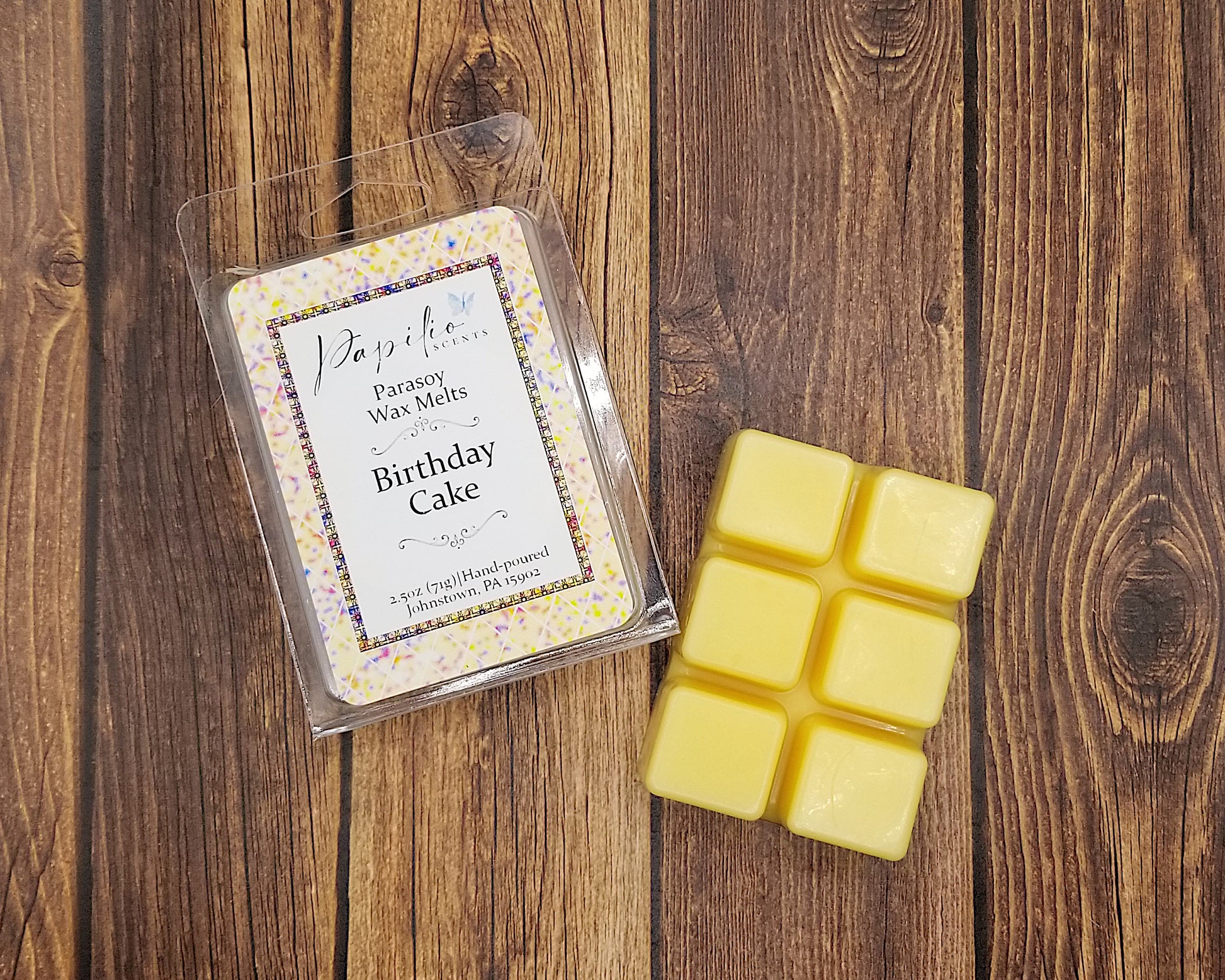 These wax melts are made with a mix of paraffin and soy (parasoy) wax to help give it a longer melt time while keeping the scent on the stronger side. Due to the handmade nature of these wax melts, there will be slight differences between melts such as glitter placement, drizzle location, and color.