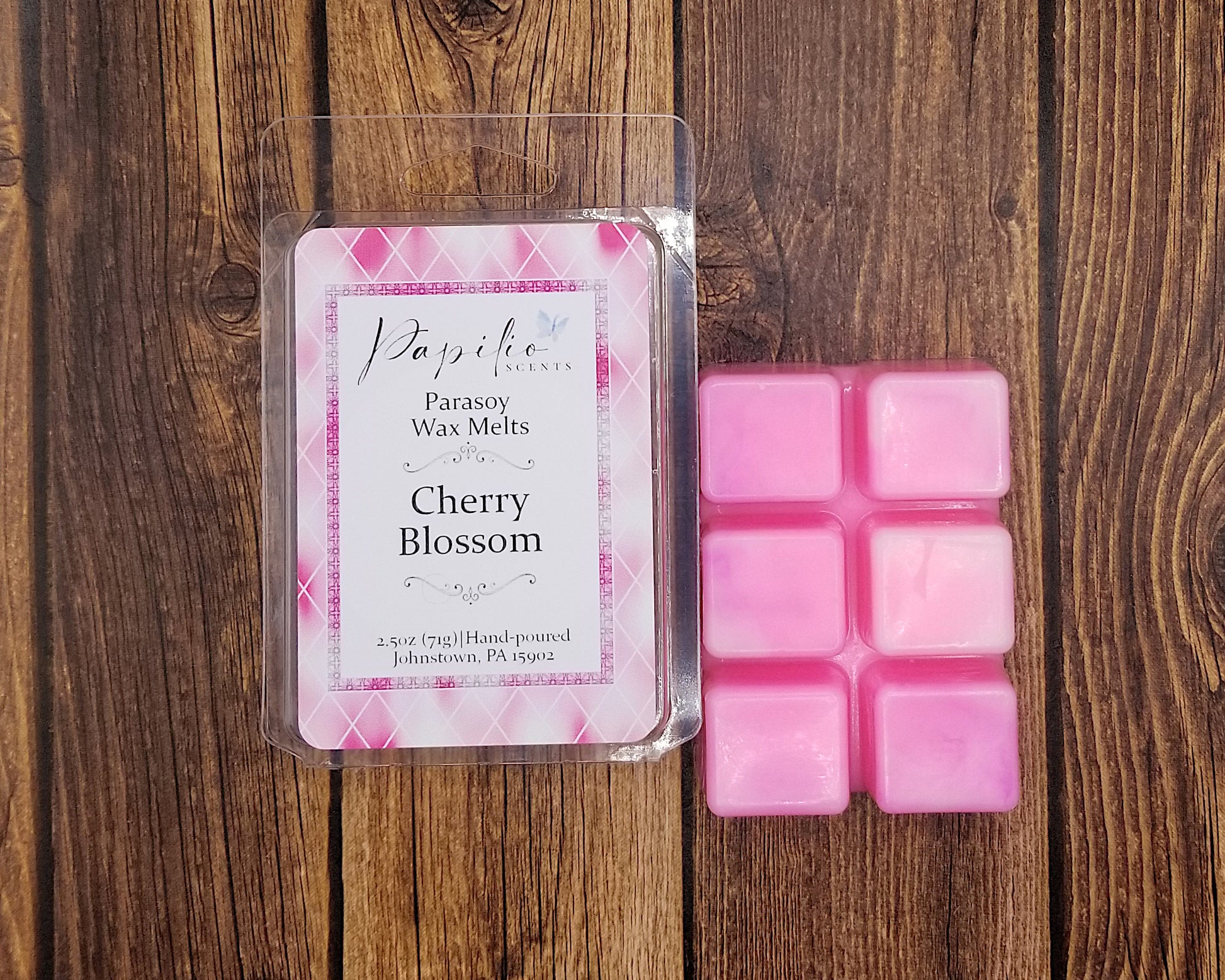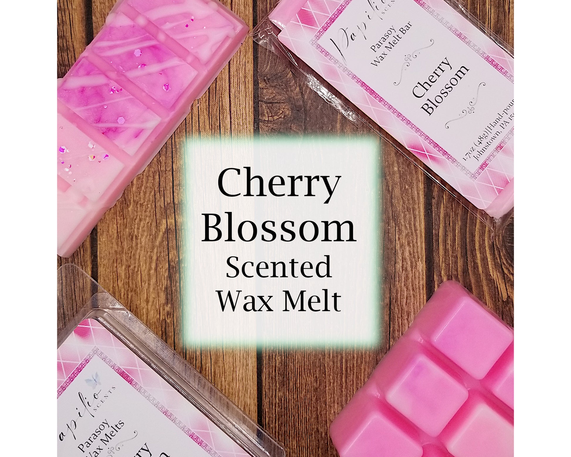 These wax melts are made with a mix of paraffin and soy (parasoy) wax to help give it a longer melt time while keeping the scent on the stronger side. Due to the handmade nature of these wax melts, there will be slight differences between melts such as glitter placement, drizzle location, and color.