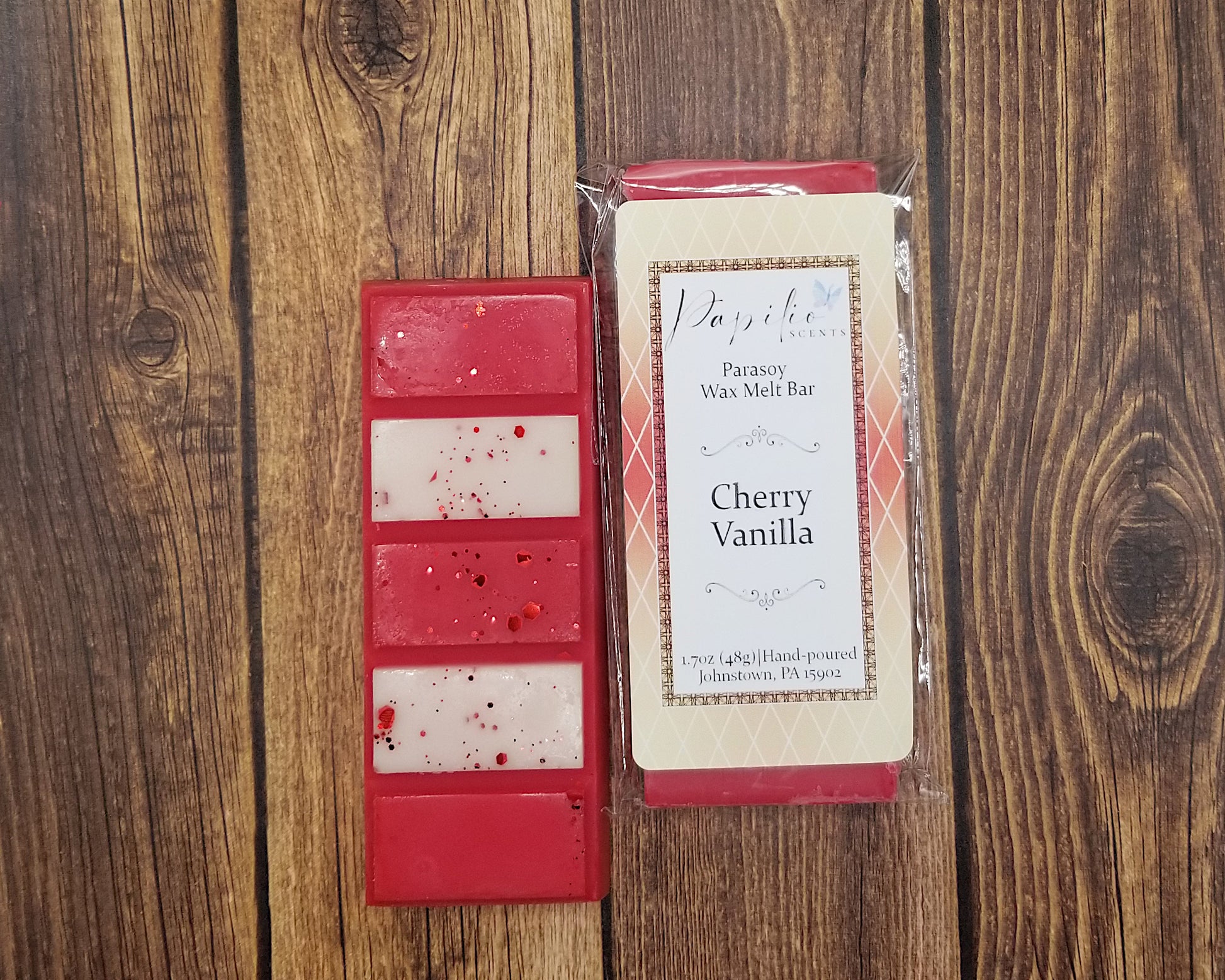 These wax melts are made with a mix of paraffin and soy (parasoy) wax to help give it a longer melt time while keeping the scent on the stronger side. Due to the handmade nature of these wax melts, there will be slight differences between melts such as glitter placement, drizzle location, and color.